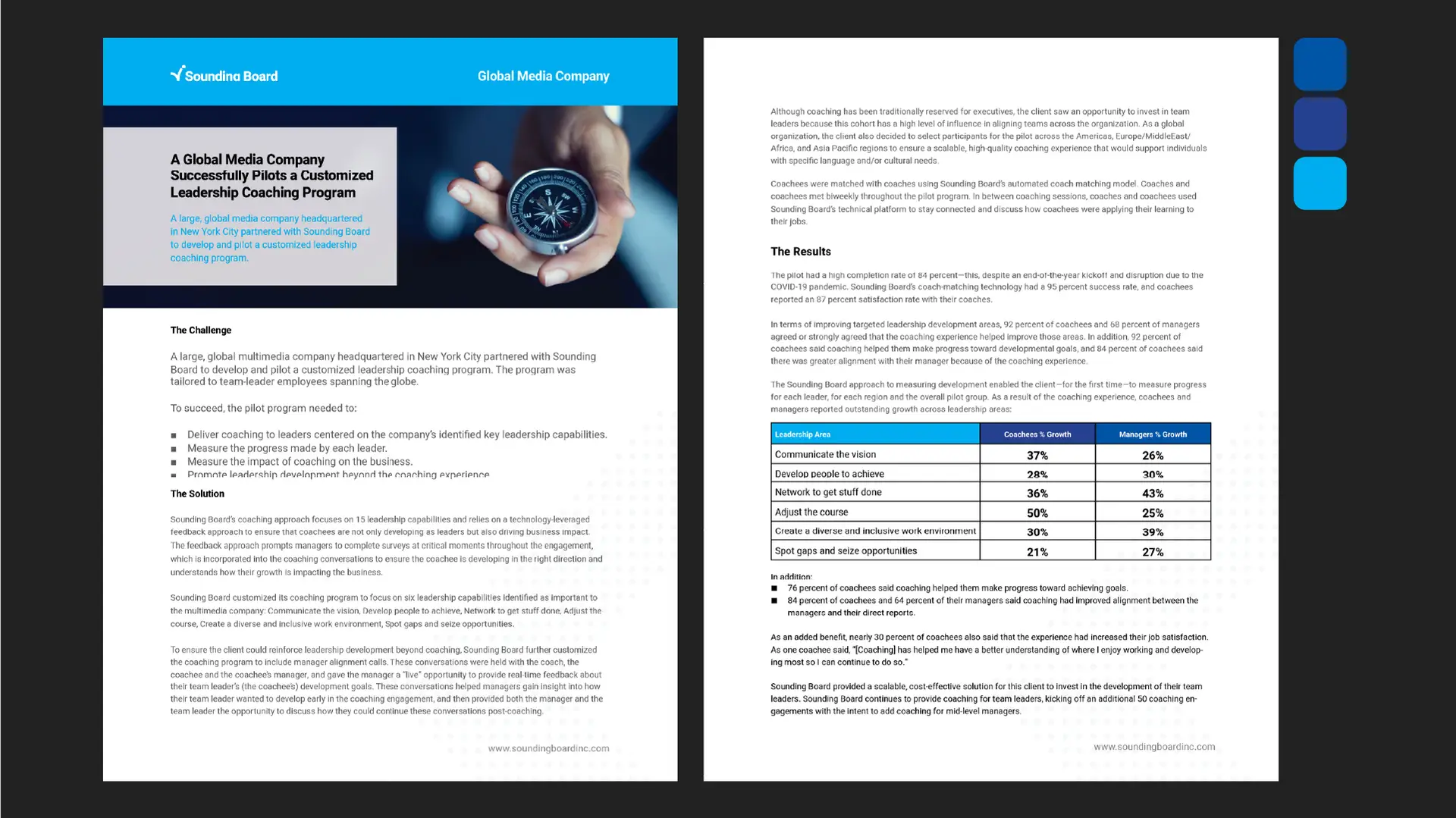 Case studies are more than just success stories; they are strategic tools used to elevate a brand’s presence in the market. As a Creative Director, I’ve crafted these case studies to not only demonstrate the tangible benefits of leadership coaching but also to position Sounding Board as a thought leader in leadership development. By showcasing how our services have transformed client organizations, I ensure that each case study reflects our company’s mission and reinforces our brand’s position as a trusted partner in leadership solutions.